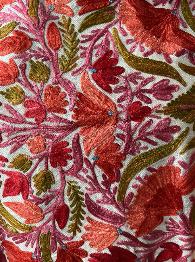 Handgefertigt aus 100 % feiner Wolle, verfügt er über exquisite Blumenstickereien in lebendigen Rot-, Korallen-, Rosa- und Olivtönen, die jedem Detail Wärme und Leben verleihen.