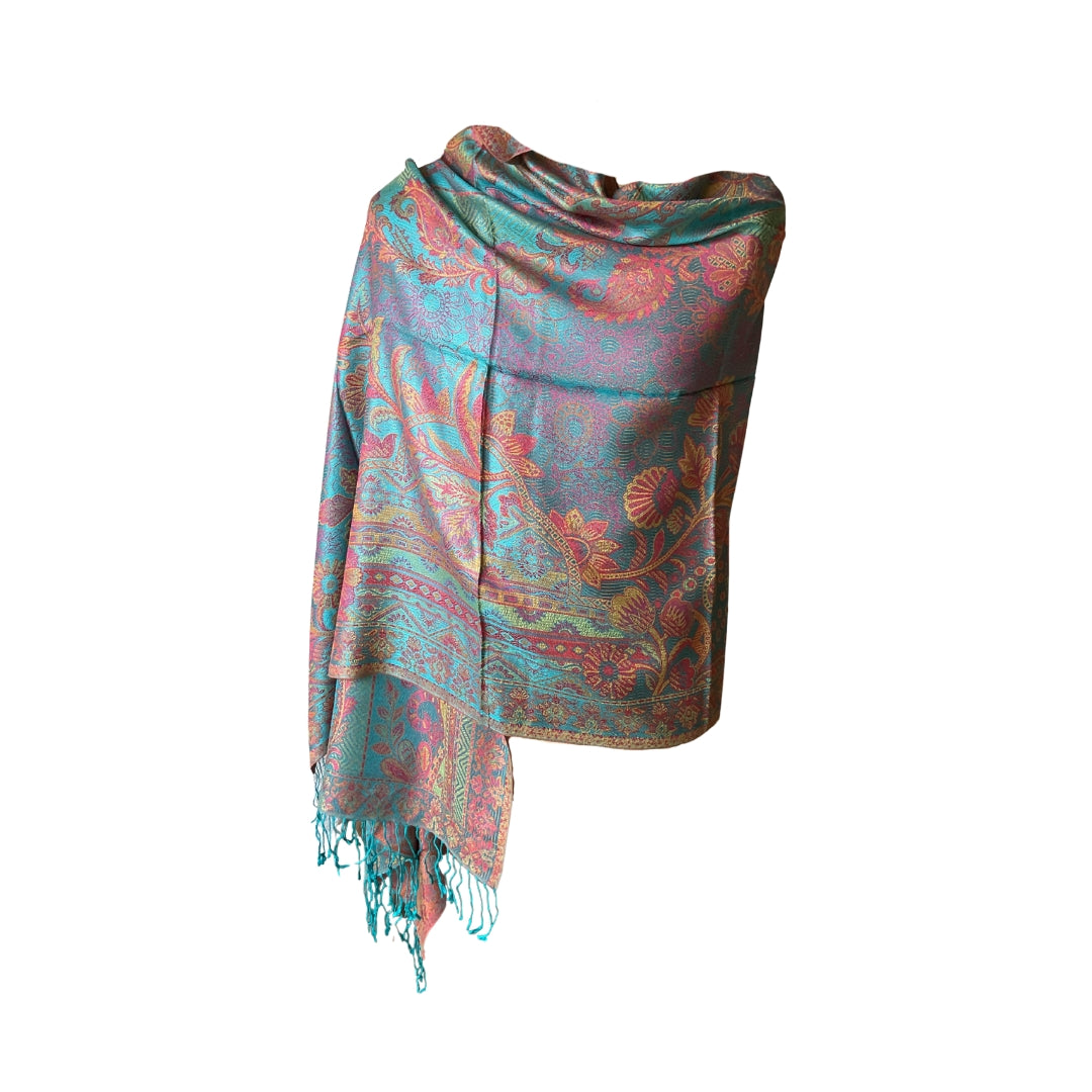 Dieses exquisite Stück ist aus reiner Seide gefertigt und besticht durch einen leuchtend türkisfarbenen Grundton, der mit aufwendigen Blumen- und Paisleymotiven in schimmernden Gold-, Korallen- und Rosétönen verziert ist.