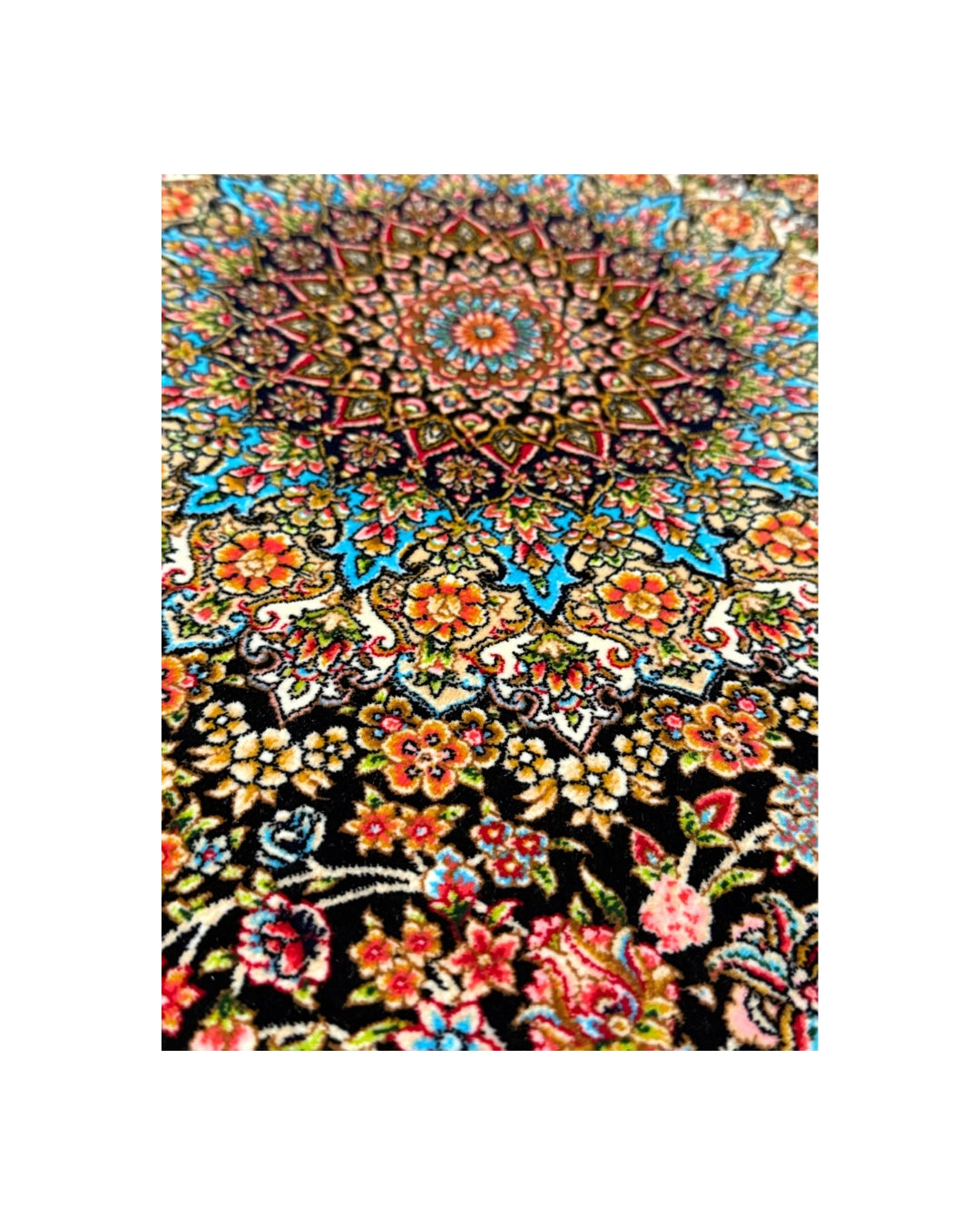Gefertigt aus 100 % natürlicher Seide, besticht dieser Teppich durch seine außergewöhnlich glatte, seidige Haptik und seinen leuchtenden Glanz, der sich je nach Lichteinfall subtil verändert. Das opulente Dekor entfaltet sich auf einem tiefen, intensiven Grundton und ist um ein fein ausgearbeitetes zentrales Medaillon aufgebaut, das von einer Fülle floraler Motive inspiriert von der klassischen persischen Kunst umgeben ist. Das Ergebnis ist ein kraftvolles Spiel aus Tiefe, Bewegung und raffinierter Eleganz.