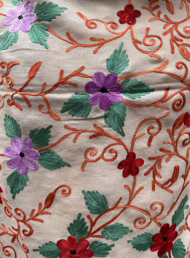 Confectionné en laine fine, il présente de délicats motifs floraux brodés à la main dans des teintes vives de rouge, violet et vert, s’épanouissant avec élégance sur une base ivoire douce. Le contraste entre la broderie vibrante et le fond clair confère à Angelina un caractère raffiné et distinctif.