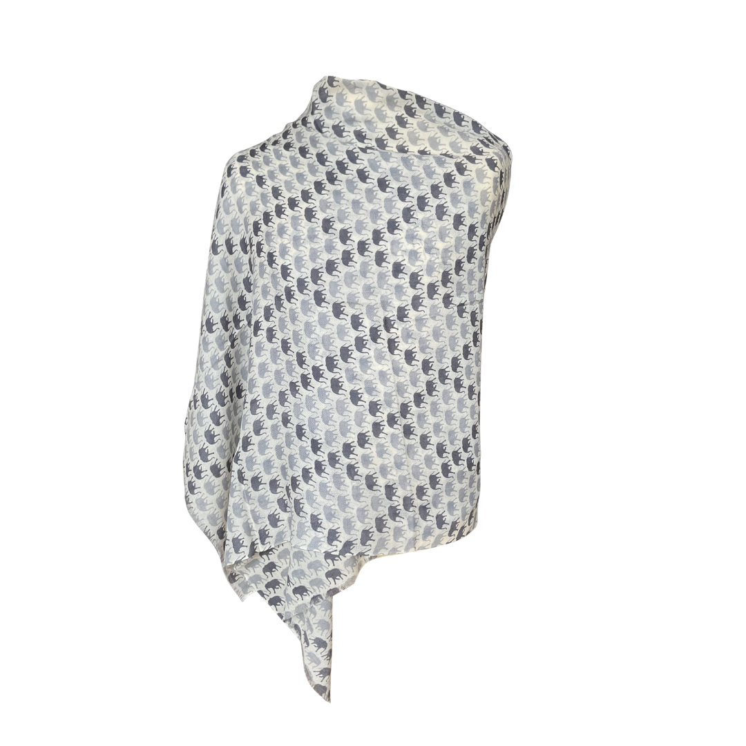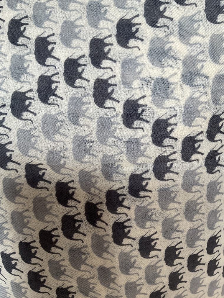 Confectionnée à partir de 100 % de cachemire premium, elle se distingue par un motif d’éléphants délicat dans des nuances douces de gris et de noir, symbolisant la sagesse, le calme et la résilience.