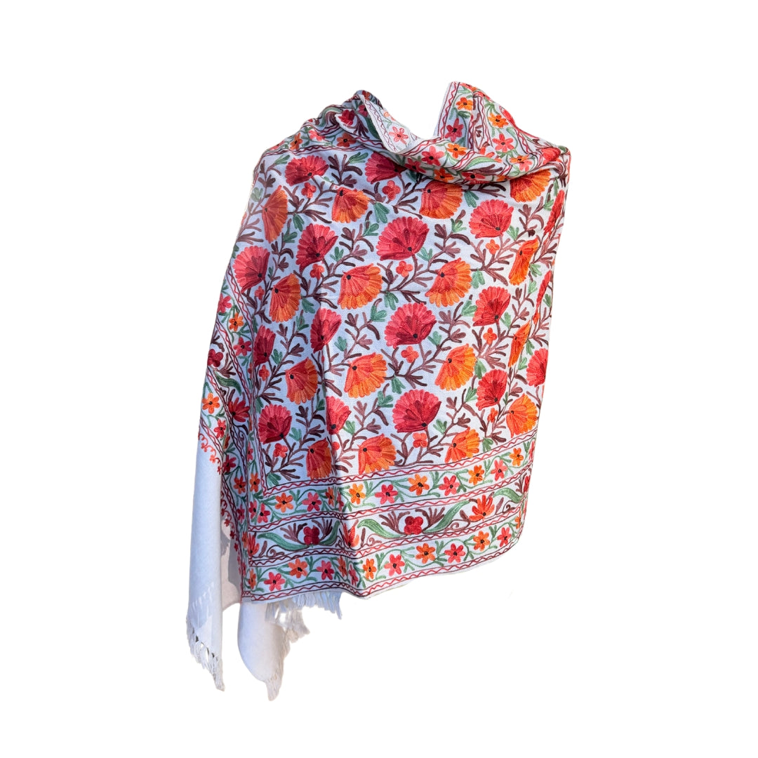 Le châle en laine brodé Aishiteru Elaris est confectionné en laine fine et délicatement orné de broderies réalisées à la main, célébrant le sens du détail artisanal et la beauté naturelle. Des motifs floraux stylisés s’épanouissent sur un fond clair et doux, brodés dans de riches nuances d’orange brûlé, de rouge profond, de terracotta chaleureuse et de délicates touches de vert.