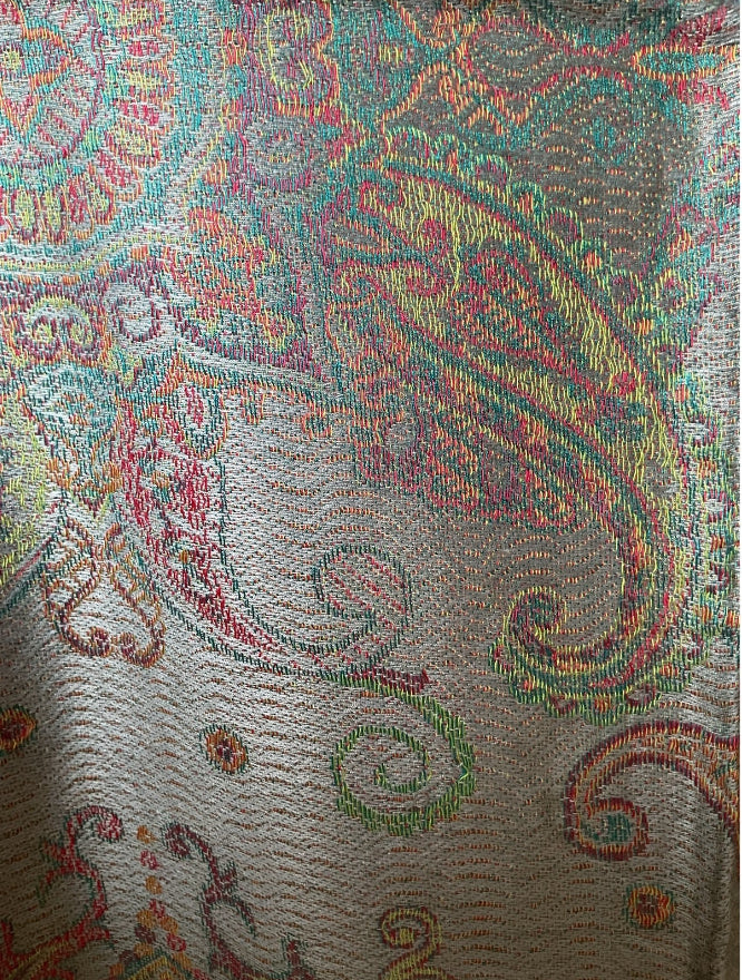 Tissé en pure soie , il présente des motifs cachemire et floraux complexes dans une palette raffinée de gris argenté, de corail doux et de vert menthe , illuminés par des reflets irisés qui changent magnifiquement sous la lumière.