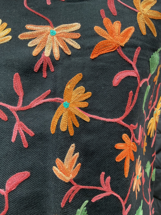 Confectionné en laine fine et brodé à la main avec des motifs floraux doré-jaune et orange éclatants, il s’épanouit avec grâce sur un fond noir profond. Ce contraste saisissant fait de Noire une pièce véritablement intemporelle, alliant sophistication audacieuse et charme artisanal.