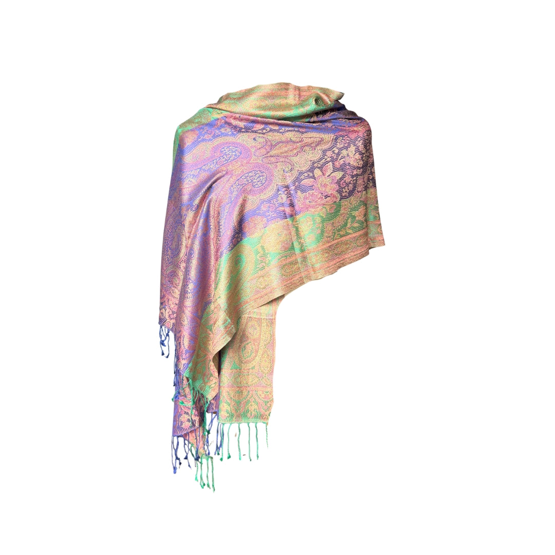 Le châle en soie Aishiteru Seralyne révèle un jeu envoûtant de couleurs et de lumière. Confectionné en 100 % pure soieet orné de motifs floraux et cachemire délicats, il change subtilement de teintes à chaque mouvement. Des nuances lumineuses de rose, d’or, de turquoise, de violet et de vert tendre créent une brillance irisée presque magique.