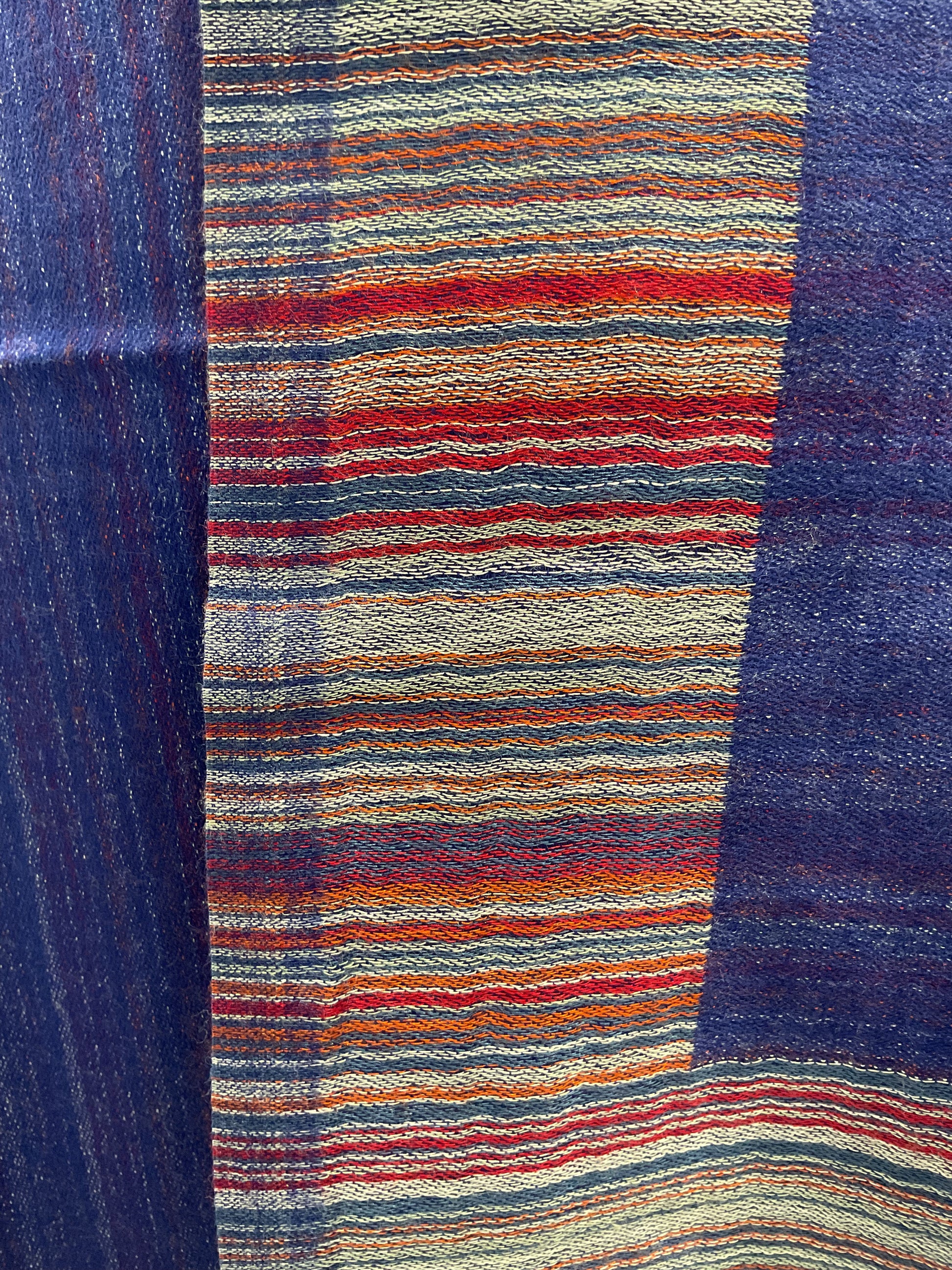 Sa base bleu profond, contrastée par des bordures rayées multicolores éclatantes, crée un design à la fois polyvalent et saisissant – passant avec aisance d’une tenue de jour à une allure de soirée. Léger, doux et enveloppant, ce châle est un accessoire intemporel et un héritage de luxe.
