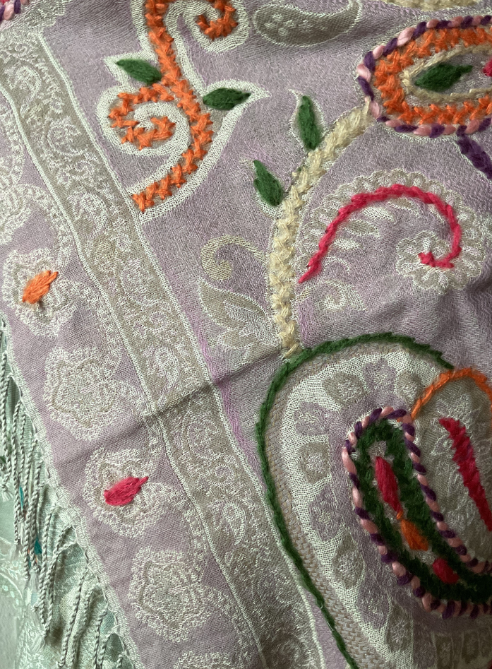 Fabriqué à la main avec une précision raffinée, ce châle présente une broderie paisley complexe dans des tons doux de lilas, vert menthe, corail et ivoire — une fusion envoûtante d’art et de grâce.