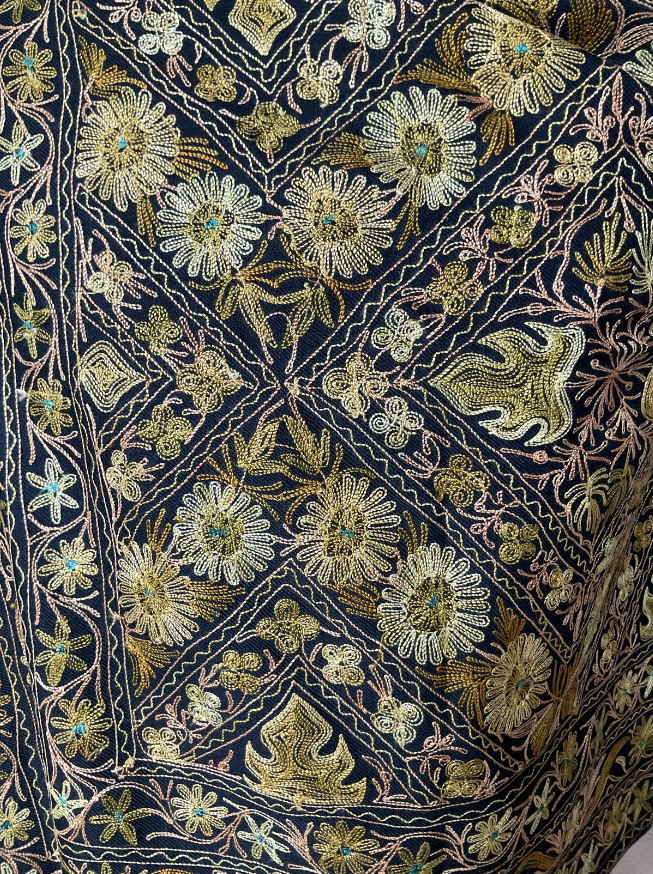 Confectionné à la main avec un souci du détail exceptionnel, sa base noire profonde est richement ornée de broderies florales dorées complexes — un captivant jeu de lumière et de texture qui évoque la grandeur d’un art intemporel.