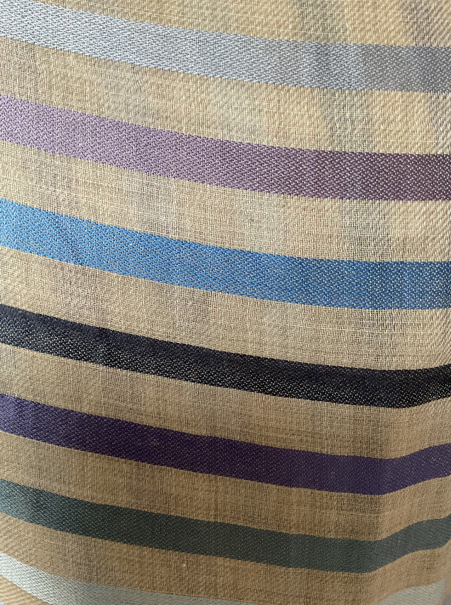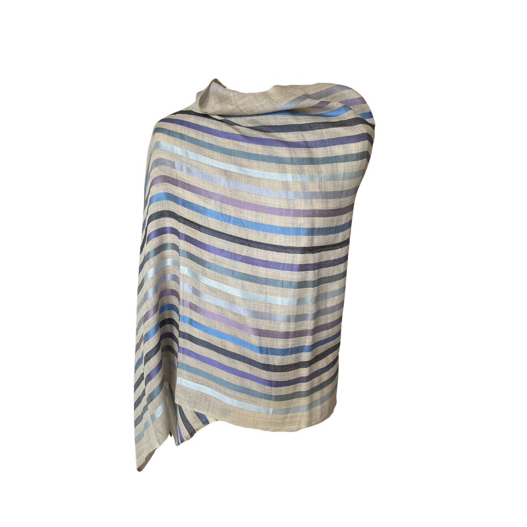 Son délicat motif rayé dans des tons doux de bleu, lilas, sable et ardoise évoque un horizon calme — intemporel, serein et élégamment simple.